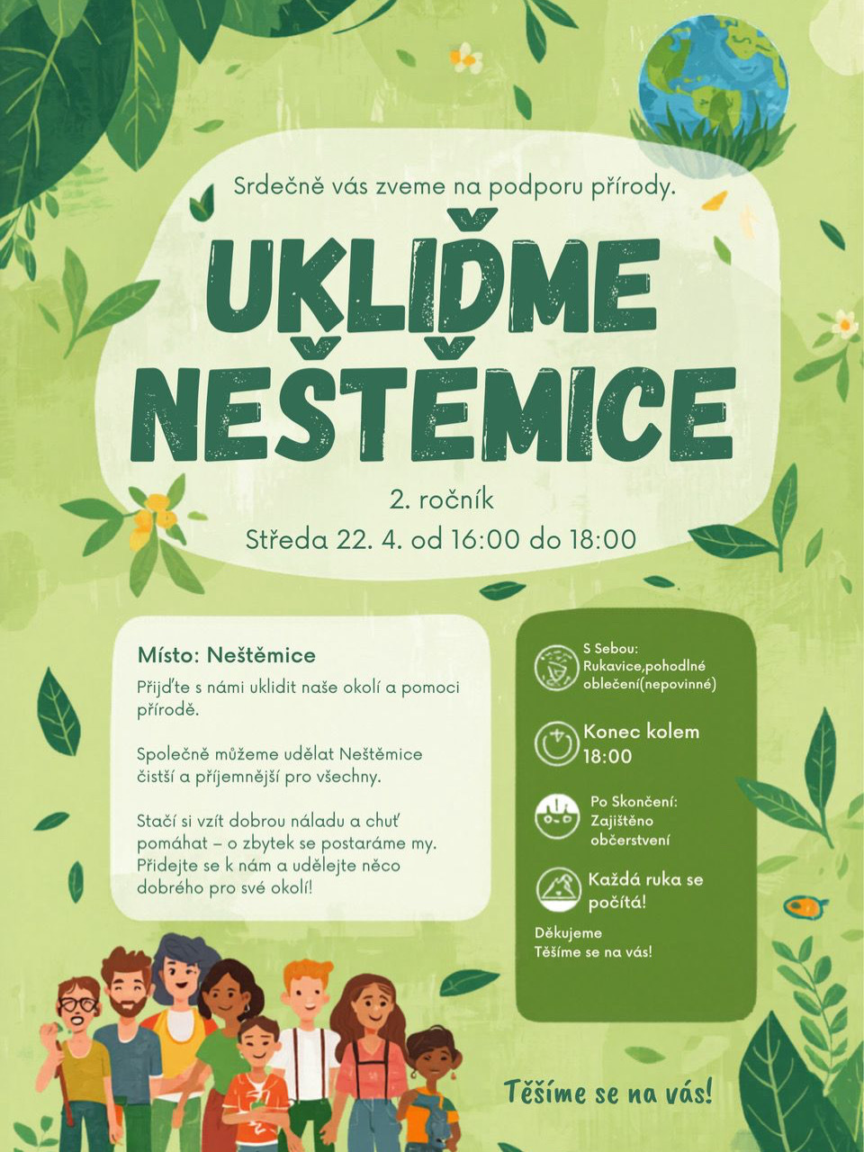 srdečně vás zveme na druhý ročník školní akce „Ukliďme Neštěmice“, která se uskuteční dne 22. dubna 2026 od 16:00 do 18:00 hodin.